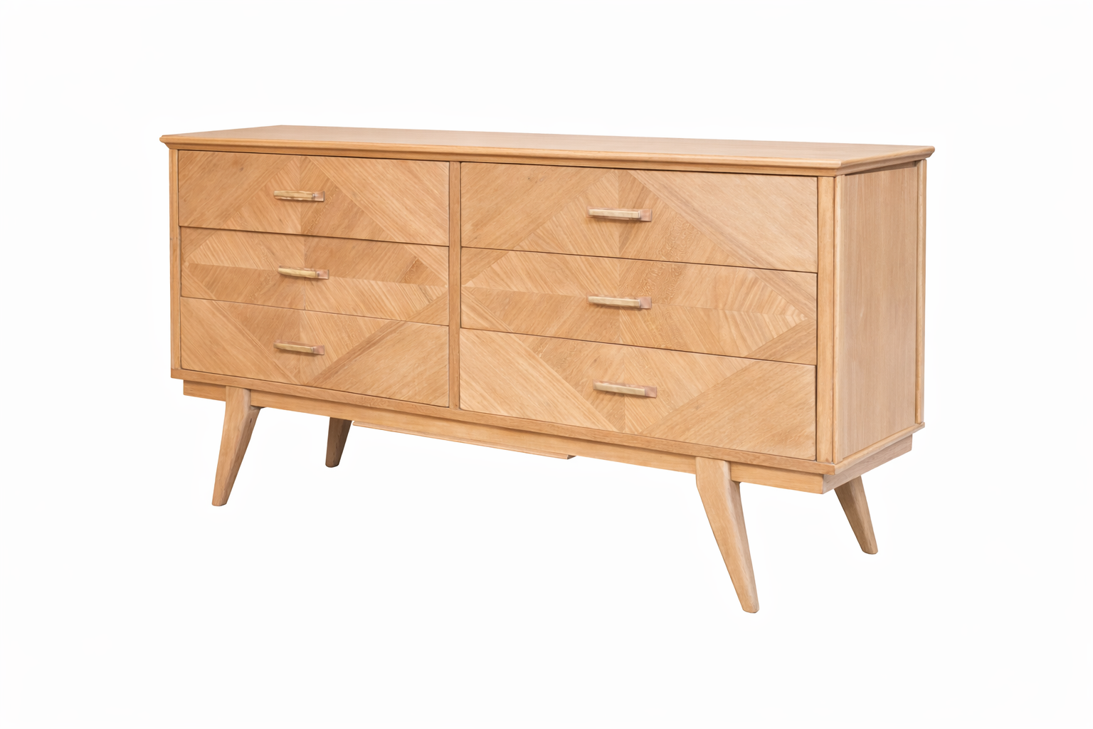 Cómoda americana con marqueria, herrajes pulidos de bronce, 6 cajones