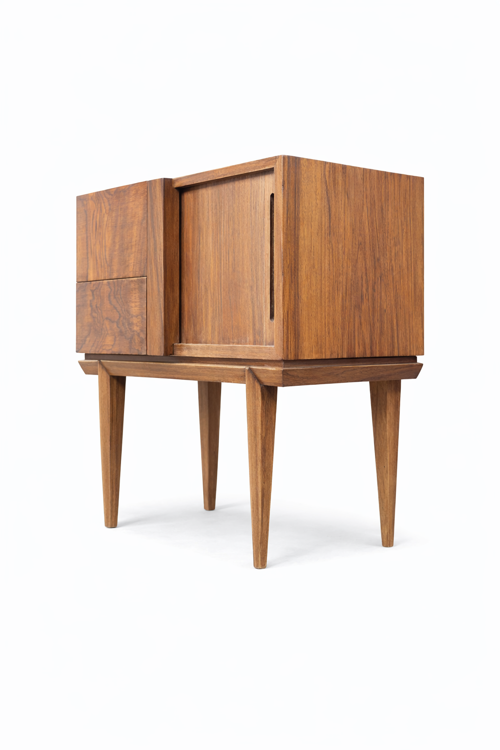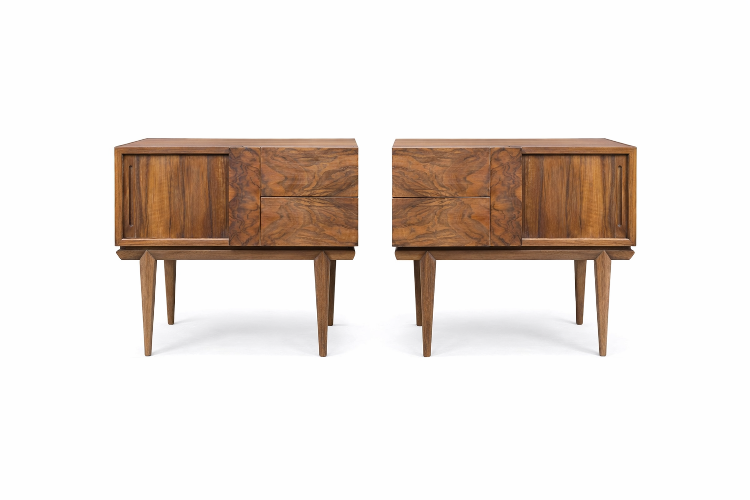 Par de mesas de luz de diseño, madera maciza en raíz de abedul, 2 cajones y un espacio adicional de guardado con persiana